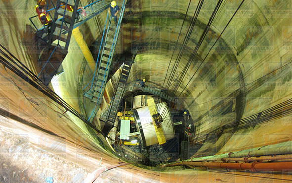 5. Liên kết vòng đệm kích với thiết bị đào; Đẩy thiết bị đào qua cửa hầm đã chuẩn bị trước tại giếng kích, bắt đầu quá trình đào, vận chuyển đất đào về phía giếng kích để đưa lên mặt đất;